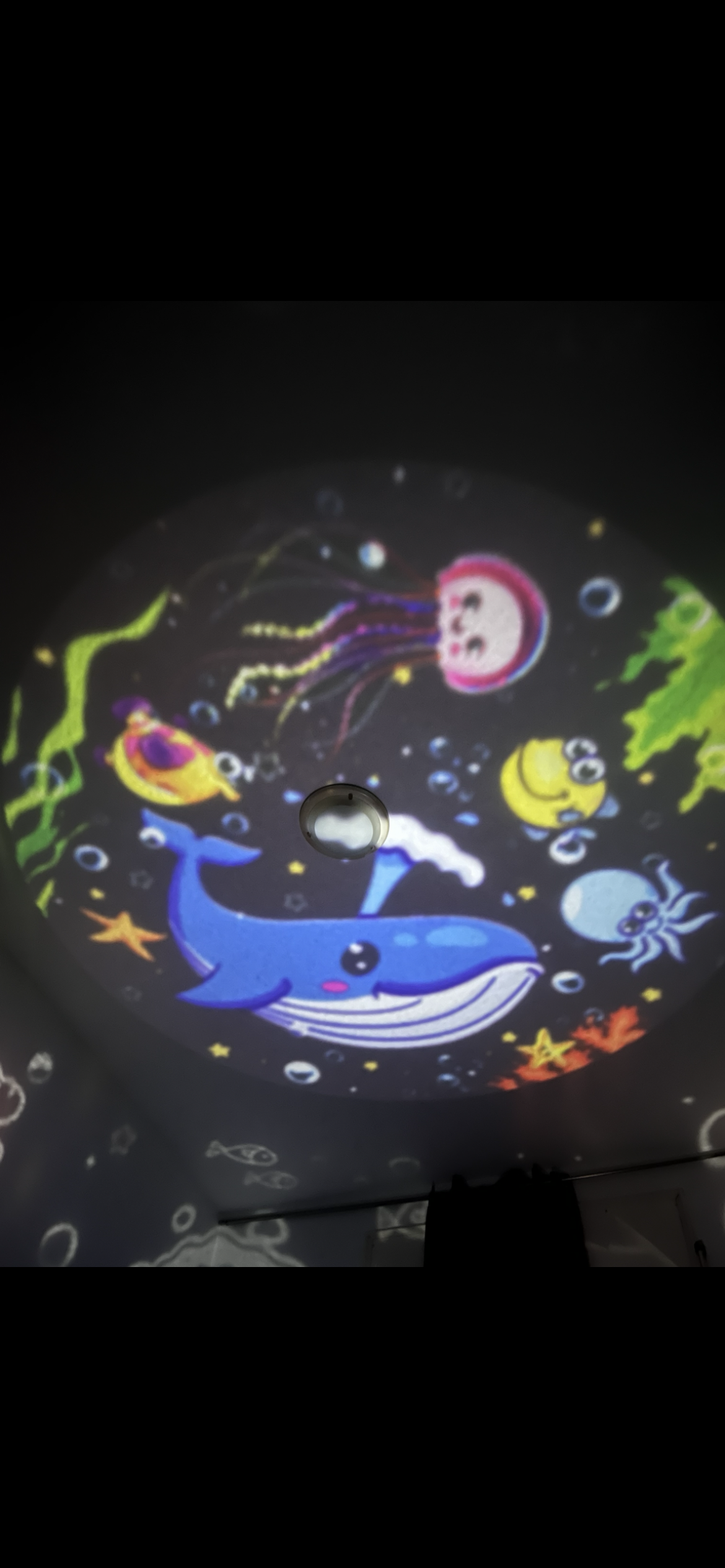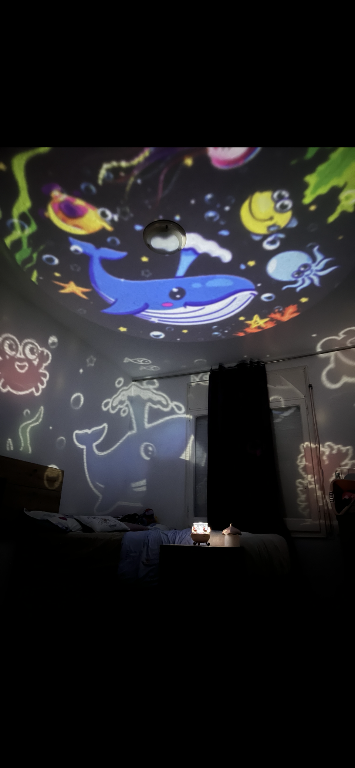 Projects vibrant ocean and space scenes across the walls and ceiling, creating a magical 360° experience your child will love.